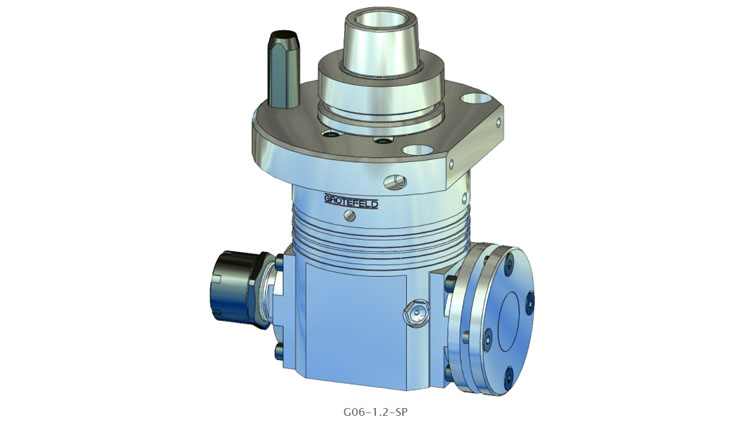 G06-1.2 系列角頭具有帶兩個(gè)刀架的連續加工主軸。這意味著(zhù)兩個(gè)刀架之一的主軸旋轉方向與驅動(dòng)旋轉方向相同,另一個(gè)刀架的主軸旋轉方向與驅動(dòng)方向相反。驅動(dòng)速度以 1:1.55 的比例傳遞到刀架。間歇運行時(shí)主軸最高轉速可達 20,000 rpm。